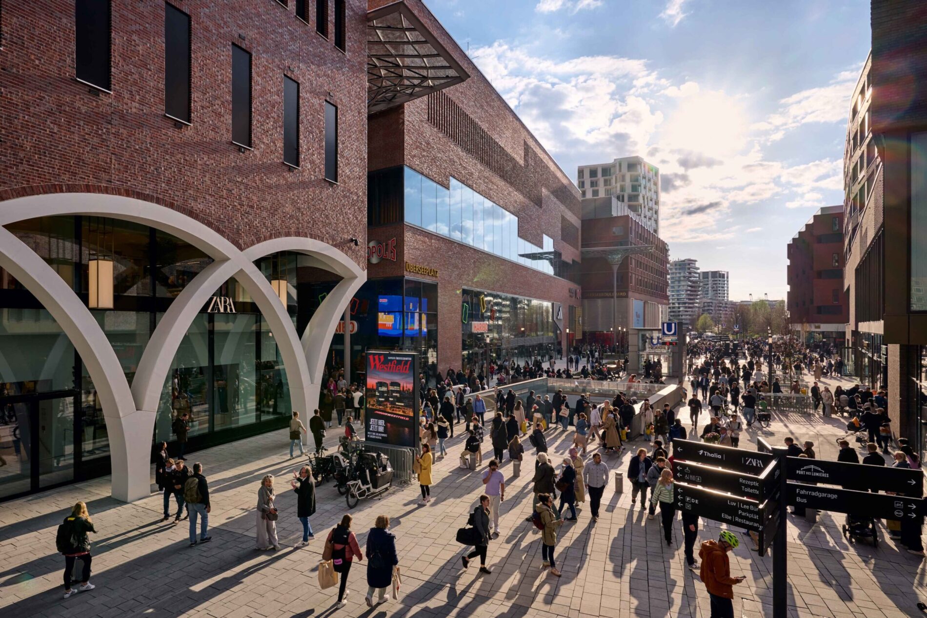 The Westfield Hamburg-Überseequartier is one of the most significant urban development projects in Germany. As the new center of Hamburg’s HafenCity district, it combines living, working, shopping, gastronomy, hotels, as well as cultural and leisure facilities to create an open and vibrant urban environment. An ensemble of 13 architecturally distinctive buildings forms a lively destination that is optimally connected to the city through its own subway station and additional mobility services.