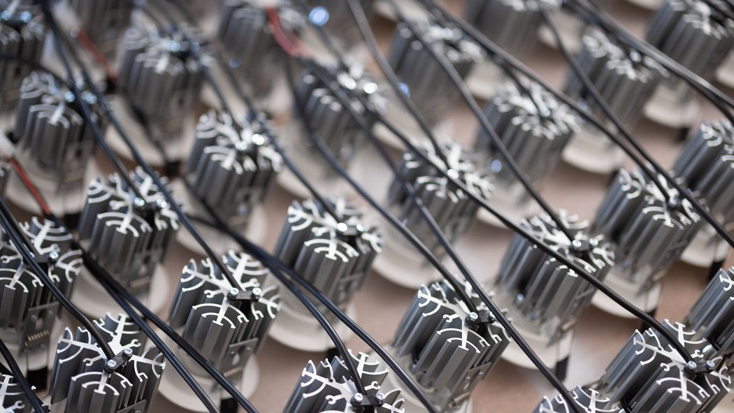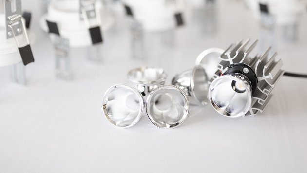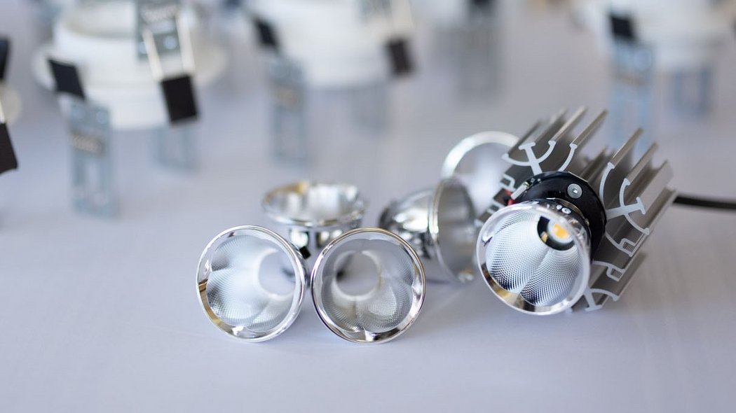 Ein besonderes Highlight der Leuchtenfamilie ist der asymmetrischen Reflektortyp. Obwohl er bündig in der Leuchtenblende sitzt, setzt sein Strahlungskegel dennoch exakt an der Wand-Deckenkante ein. Das ist eine Reflektortechnik in höchster Perfektion.